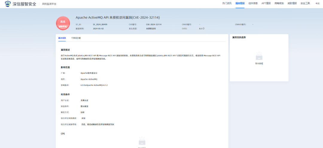 2024年5月8日,深瞳漏洞实验室监测到一则Apache ActiveMQ组件存在未授权访问漏洞的信息,漏洞编号:CVE-2024-32114,漏洞威胁等级:高危。