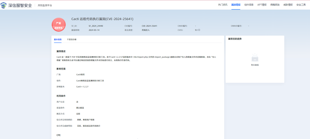 2024年5月16日,深瞳漏洞实验室监测到一则Cacti 组件存在代码注入漏洞的信息,漏洞编号:CVE-2024-25641,漏洞威胁等级:严重。