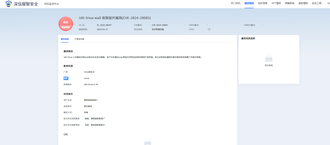 2024年5月8日,深瞳漏洞实验室监测到一则util-linux组件存在信任管理问题漏洞的信息,漏洞编号:CVE-2024-28085,漏洞威胁等级:高危。