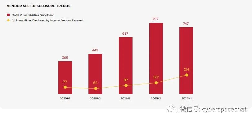 Claroty透露,供应商的自我披露首次超过独立研究机构,成为第二多产的漏洞报告者。供应商在 2022 年的前六个月发布了214 个CVE,仅次于报告了337个的第三方安全公司。发布的214 个CVE几乎是 Team82去年最后六个月报告的127个总数的两倍。此外,今年前六个月,19 家XIoT供应商首次披露信息。该名单包括医疗设备制造商、楼宇自动化供应商、IT、OT和ICS公司。