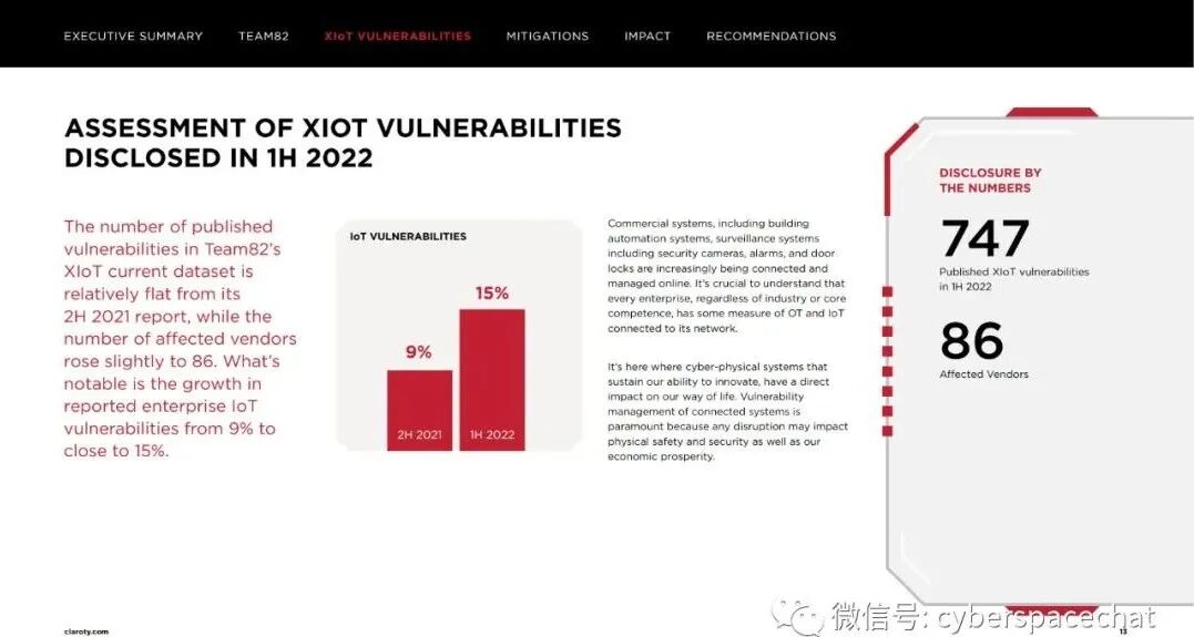 Claroty 在其《XIoT安全状况报告:2022年上半年》中报告称,连接的嵌入式物联网 (IoT)设备中披露的漏洞百分比为15%,与Team82上一份涵盖下半年的报告相比大幅增加。去年物联网占所有漏洞的9%。然而,Team82的 XIoT当前数据集中已发布的漏洞数量与其之前的报告相比基本持平,而受影响的供应商数量略有上升至86个。Team82是Claroty的研究部门。