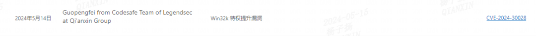 CVE-2024-30028 Win32k权限提升漏洞由奇安信代码安全实验室安全研究员发现并提交。