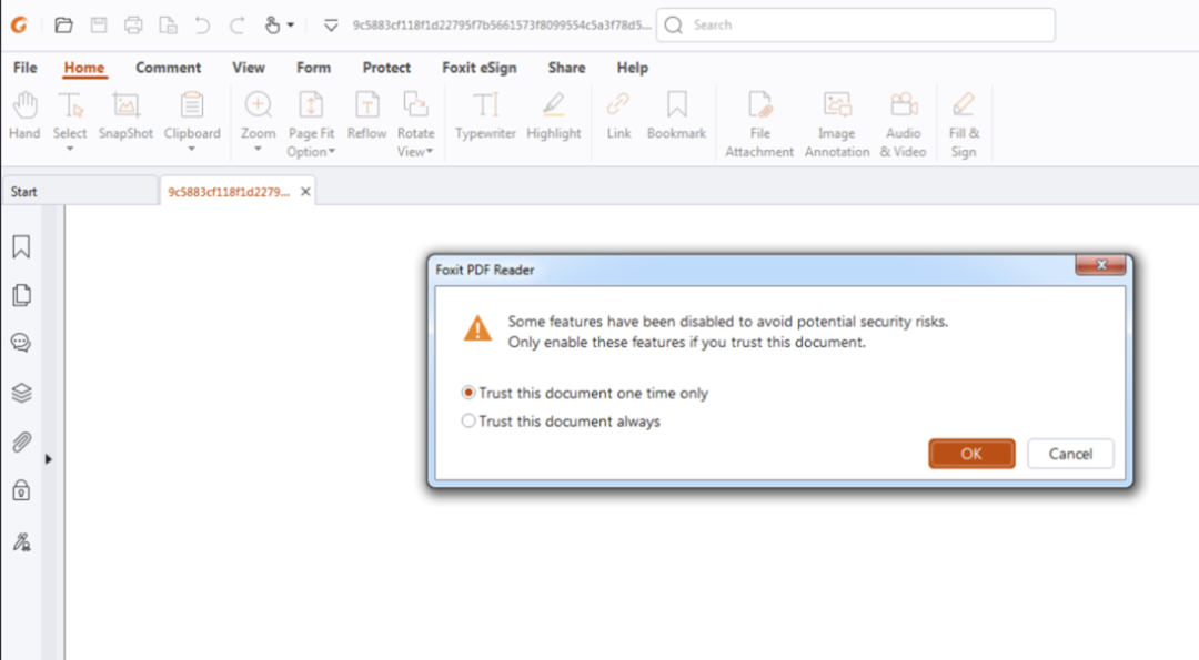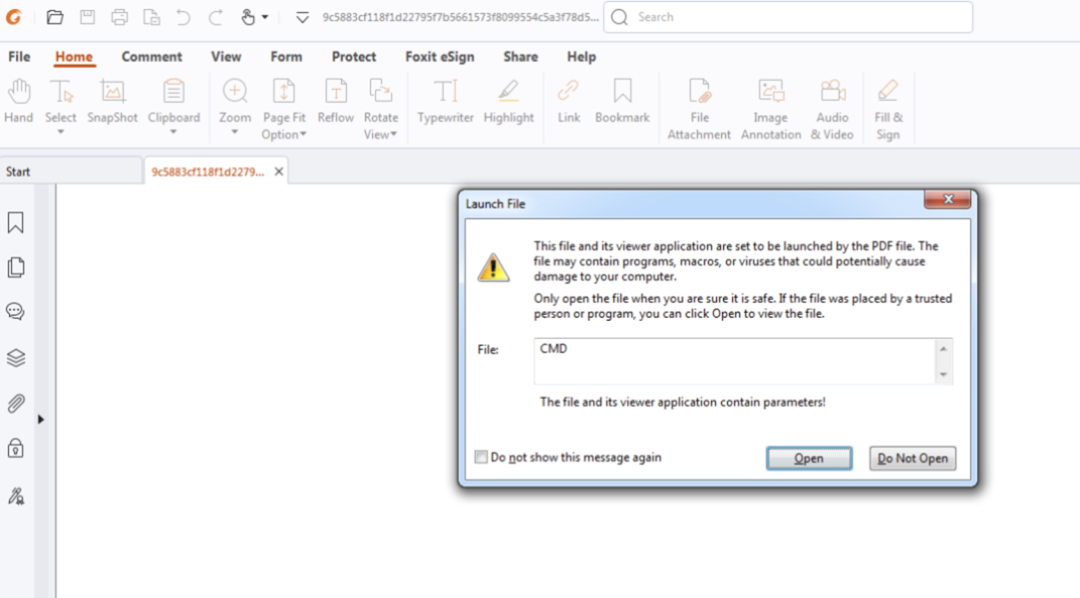 Check Point Research 发现 PDF 漏洞正在广泛传播,主要针对 Foxit Reader 用户。通过触发安全警告,毫无戒心的用户可能会被欺骗执行有害命令。