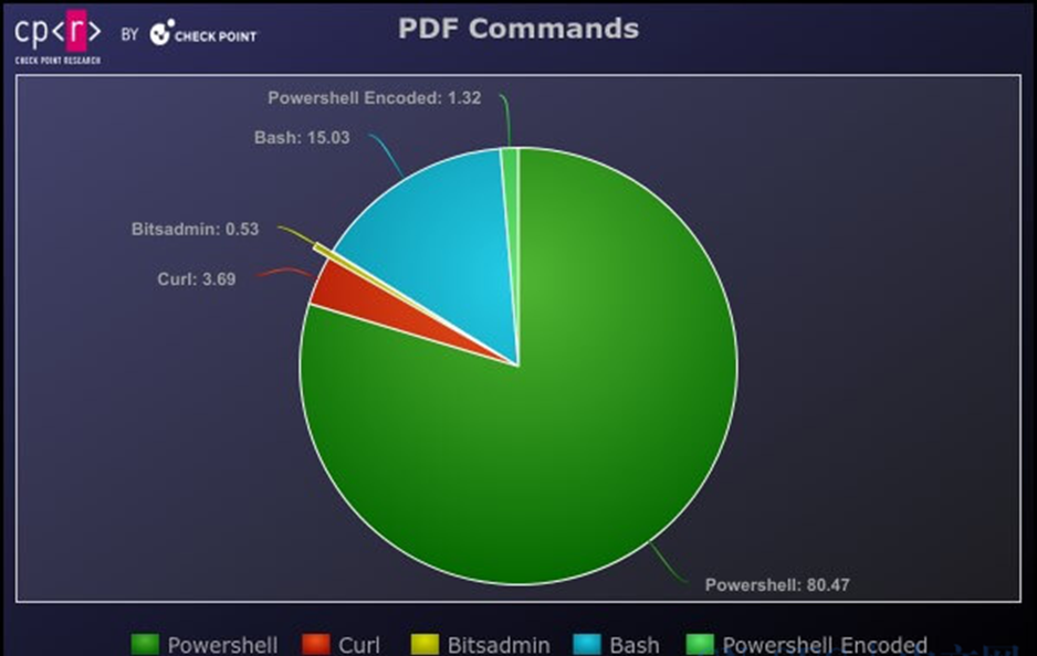 “Check Point 获得了攻击者拥有的多个构建器,这些构建器利用此漏洞创建恶意 PDF 文件。收集到的大多数 PDF 都在执行 PowerShell 命令,该命令从远程服务器下载有效负载然后执行,尽管在某些情况下使用了其他命令。”报告中写道。