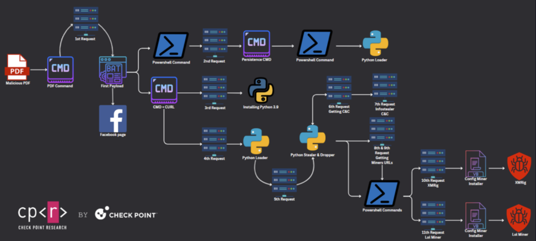 在一次恶意活动中,Check Point 跟踪了通过 Facebook 分发的链接,这导致了很长的攻击链,系统被安装了一个信息窃取木马和两个加密货币挖矿木马。