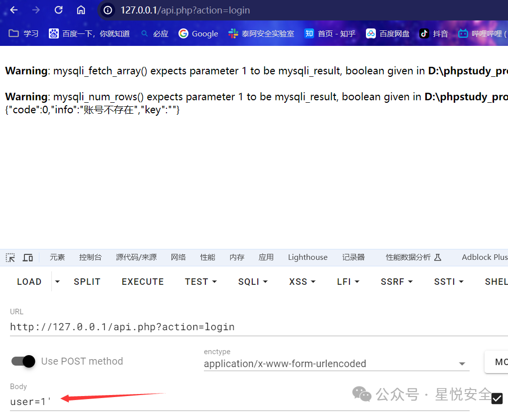 在 api.php 中,GET传入user参数并直接插入进sql语句中导致注入产生.