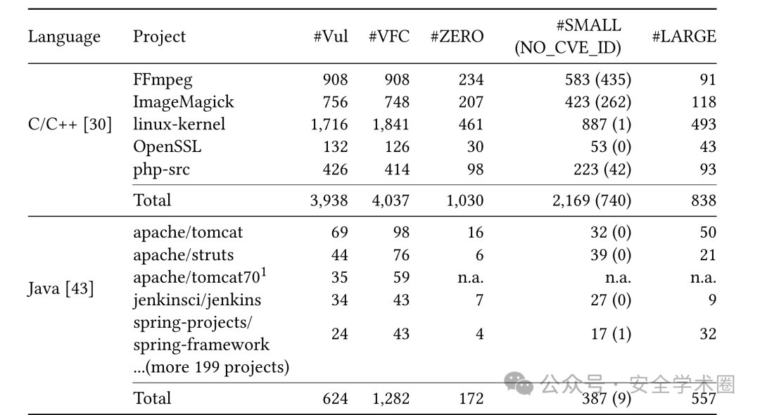 构建链接CVE漏洞的数据集,涵盖c/c++项目和Java项目,并手工验证了受这些漏洞影响的软件版本
