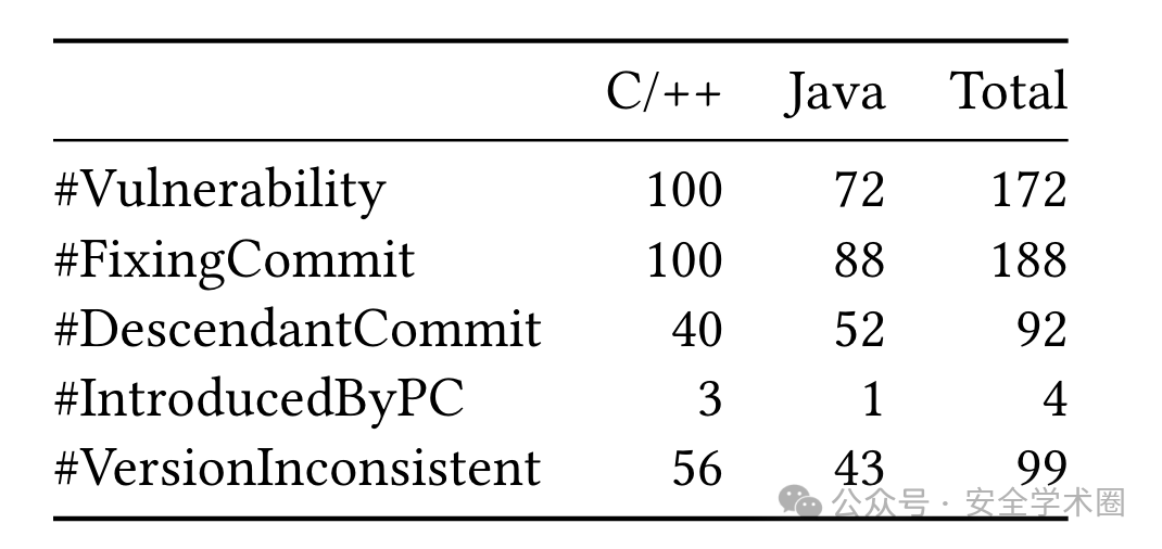 因此,最后实验数据集从剩下的C/C++每个项目中随机挑选20个漏洞共计100个,41个Java项目中剩余的72个漏洞,共计172个漏洞总数和188个提交