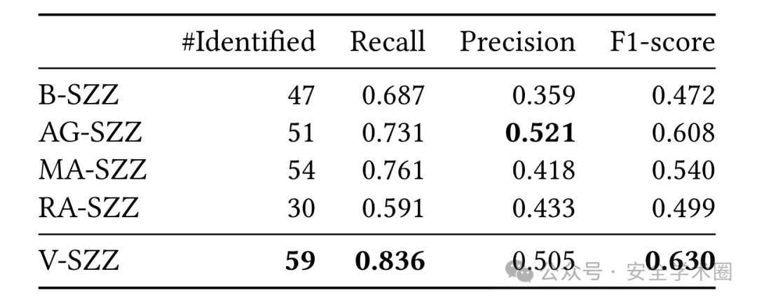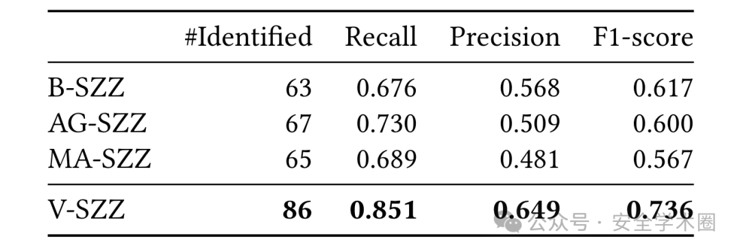 基于上述问题,作者评估了SZZ算法以及出现的许多变体的SZZ(AG-SZZ, MA-SZZ, 和 RA-SZZ)算法是否能够准确的识别漏洞诱导提交,并对原始的SZZ算法改进,提出了V-SZZ算法,以之前的算法为基线,得出了改进的V-SZZ算法准确度,并基于诱导提交有效地细化脆弱版本,再手工验证了受这些漏洞影响的软件版本,得出最后结果。