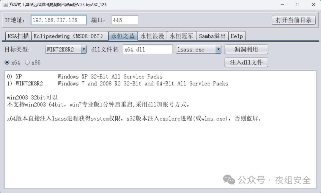 2024.03.09 优化图形界面,修复bug,重新编译。2017.12.12 完成永恒浪漫、永恒冠军的编写。2017.11.20 完成永恒之蓝Eternalblue的编写。