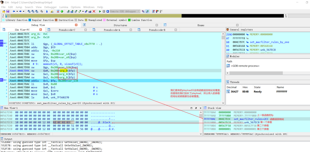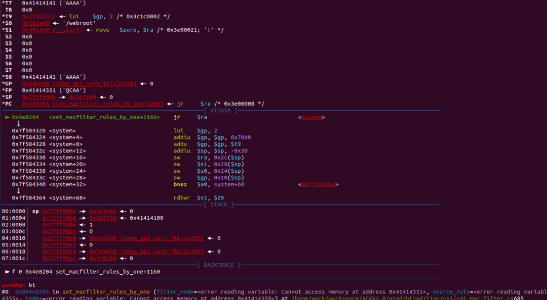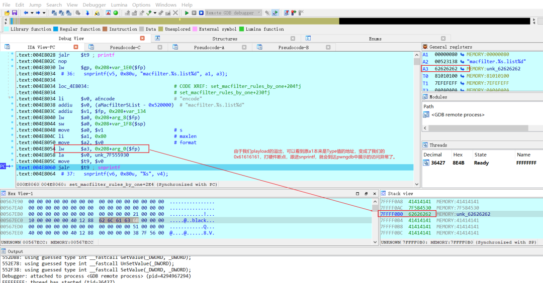而恰好,set_macfilter_rules_by_one在执行完parse_macfilter_rule函数,发生了溢出后,后面的snprintf函数调用了a1,也就是第一个参数,且a1是一个地址,但是按照我们playload覆盖后a1将变为一个值,所以会照成访问异常。