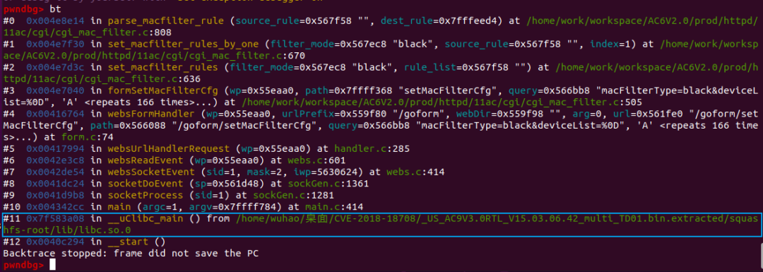 使用ida调试,最终发现会在set_macfilter_rules_by_one函数中snprintf函数报错。