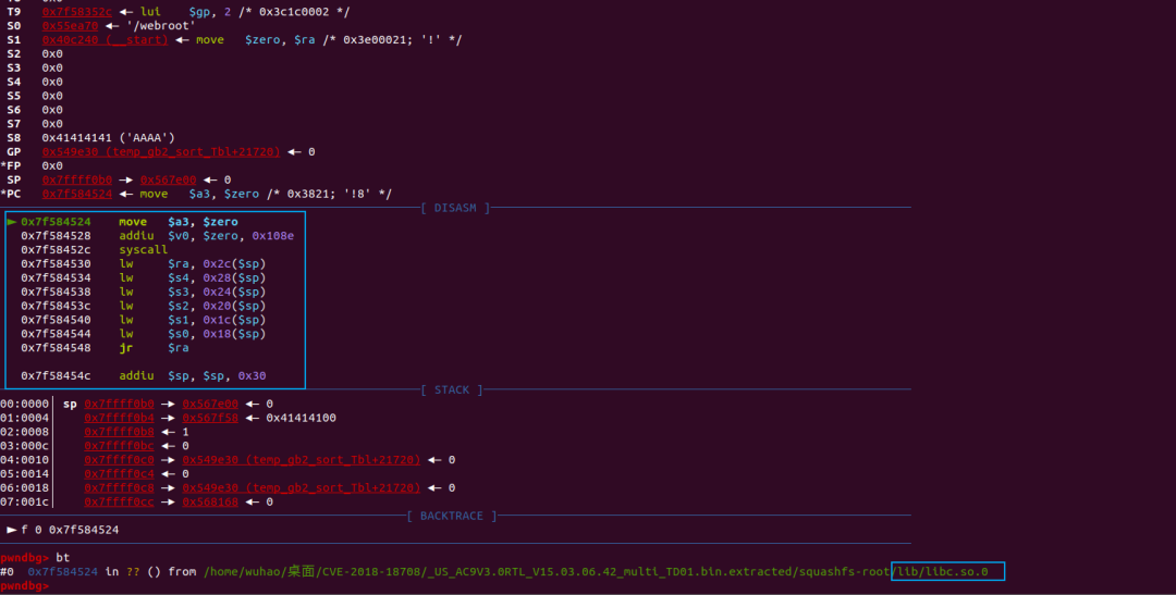 漏洞利用首先需要找到libc.so.0的基址,同样和之前的CVE-2018-5767一样,同样vmmap无法使用,但是这里我还是找到了一个比较特殊的方法找到了基址。
