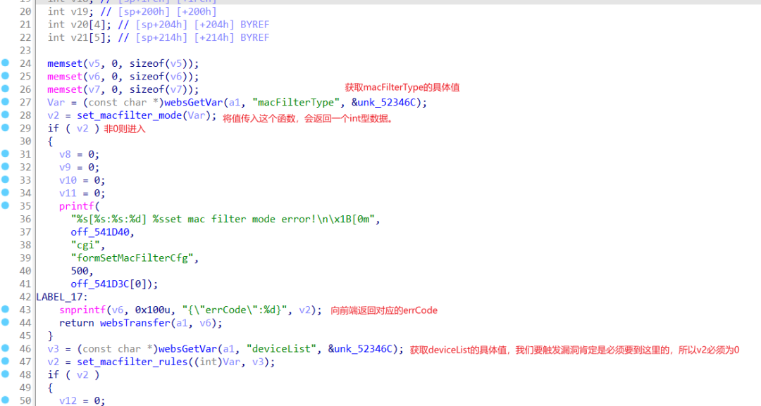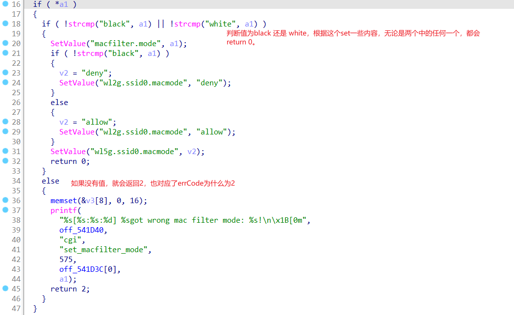 返回了个{“errCode”:2},我们到formSetMacFilterCfg函数内部,查看setMacFilterCfg接口对应的处理过程,需要注意的是这些地方。