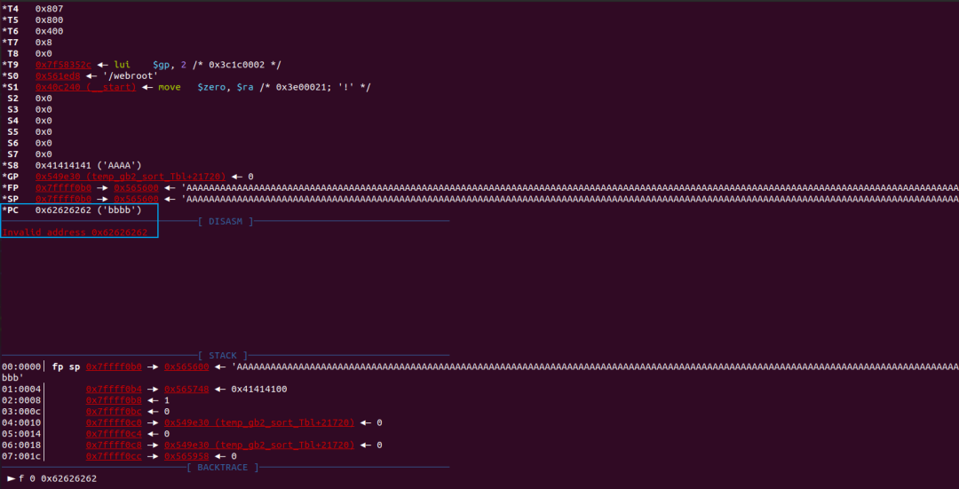 这里爆了个访问错误,$v0应该是个地址,但是变成了我们的0x41414141。