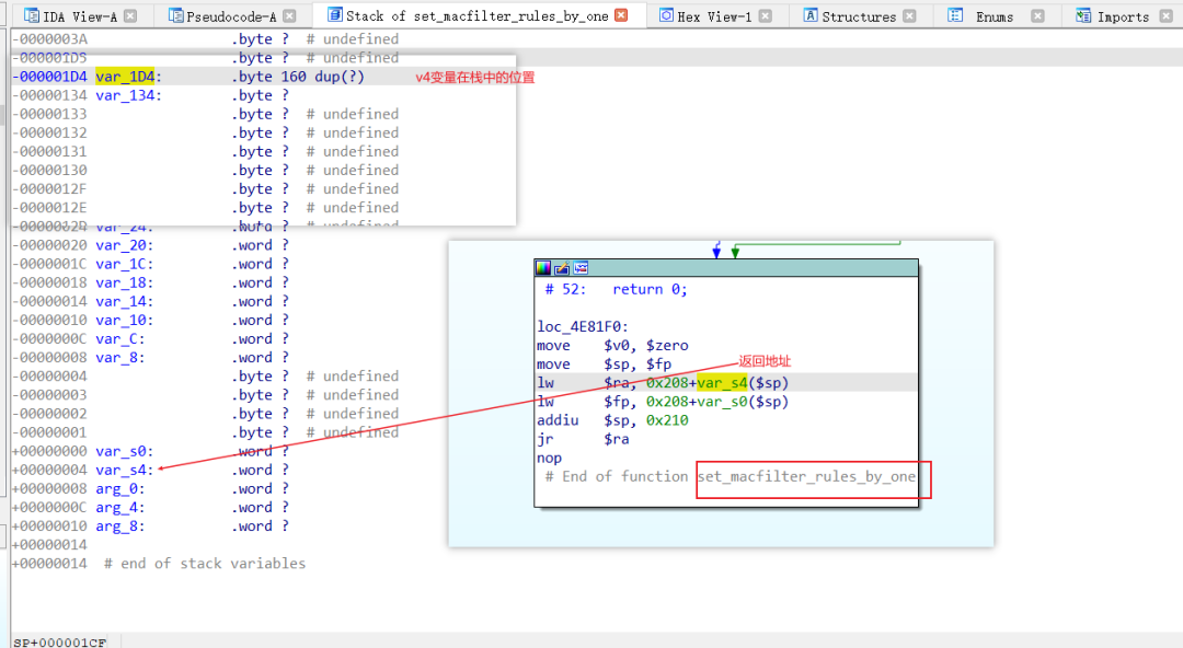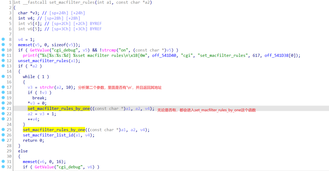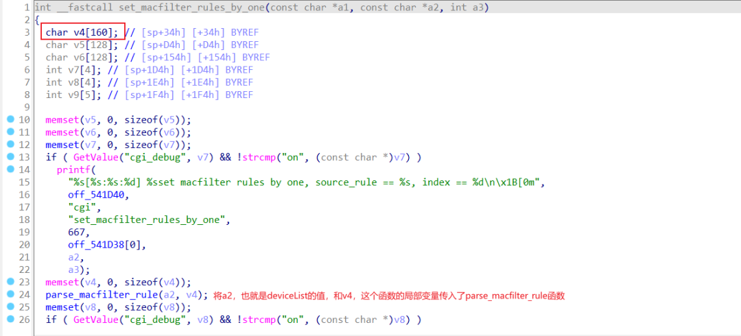 进入set_macfilter_rules_by_one,实际上这个才是会发生溢出的函数,其v4变量会由于parse_macfilter_rule中的strcpy导致溢出而覆盖返回地址。