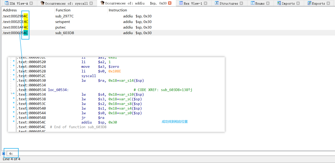 这里我是alt+t搜索addiu $sp, 0x30,当然搜索syscall也行。并且再次根据后两个字节4c过滤了大量结果。