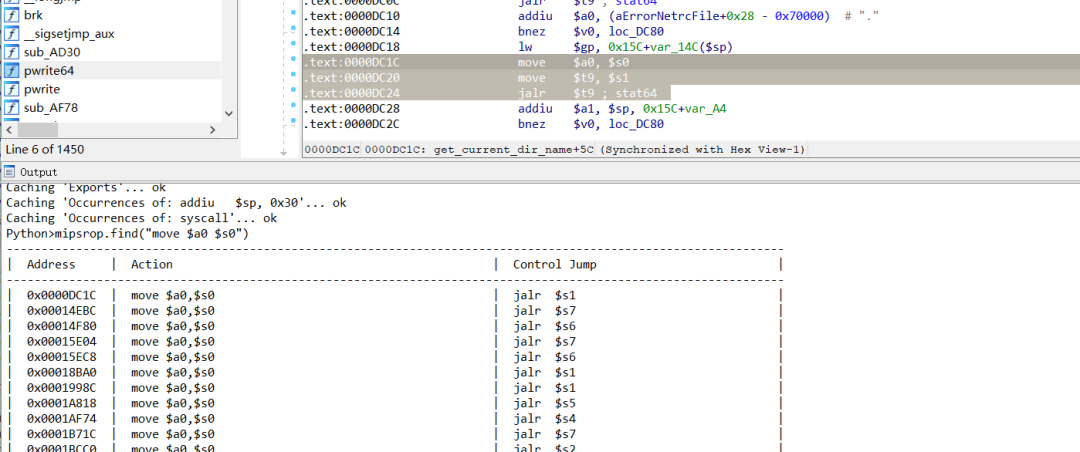 对于mips下rop链的构造,经常使用到的是move $a0 $s0,我们使用mipsrop去查找一些可用的。