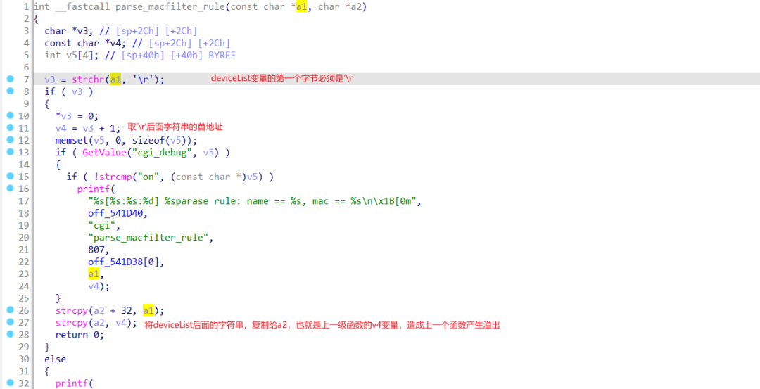 进入parse_macfilter_rule函数,分析得知,deviceList第一个字节必须是’\r’。