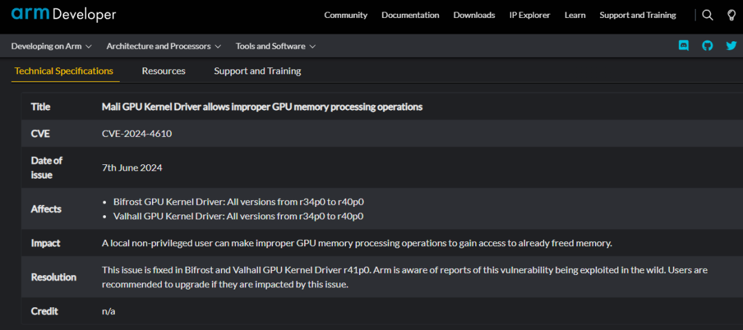 Arm已确认有关漏洞在现实场景中被利用的报告,并建议受到此问题影响的用户升级系统。CVE-2024-4610已在最新的驱动程序更新r41p0中得到解决,适用于Bifrost和Valhall GPU内核驱动程序。但要注意到补丁的部署取决于设备制造商和供应商在整合和分发更新方面的效率。组织仍须保持警惕,确保及时更新以减轻与此漏洞相关的风险。