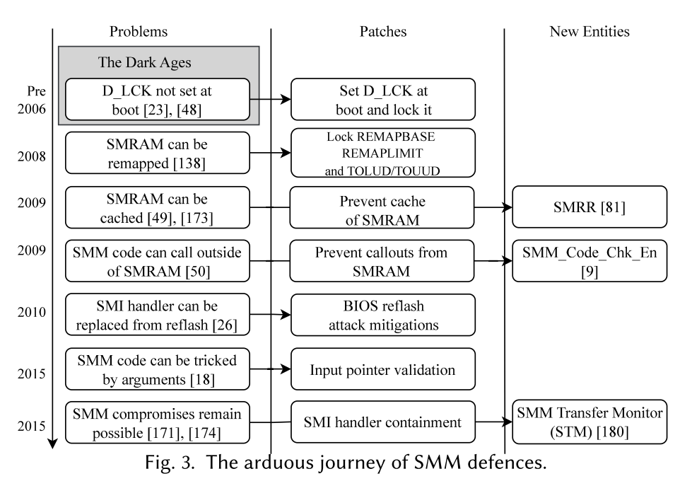 论文的最后部分(第6章)提到了安全攻击,也是我们读者会比较感兴趣的内容。特别地,作者用了前面提到过的SMM作为例子,讲述了它的发展史上出现的各类安全攻击(如下图所示),并把这些安全攻击分为三类——通过绕过内存隔离机制的攻击、通过侧信道手段的攻击以及通过固件更新开展的攻击。这部分还蛮有意思的,喜欢的读者可以去延伸阅读里面提到的各类安全问题的细节: