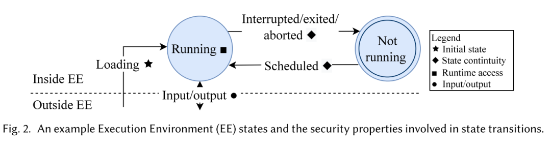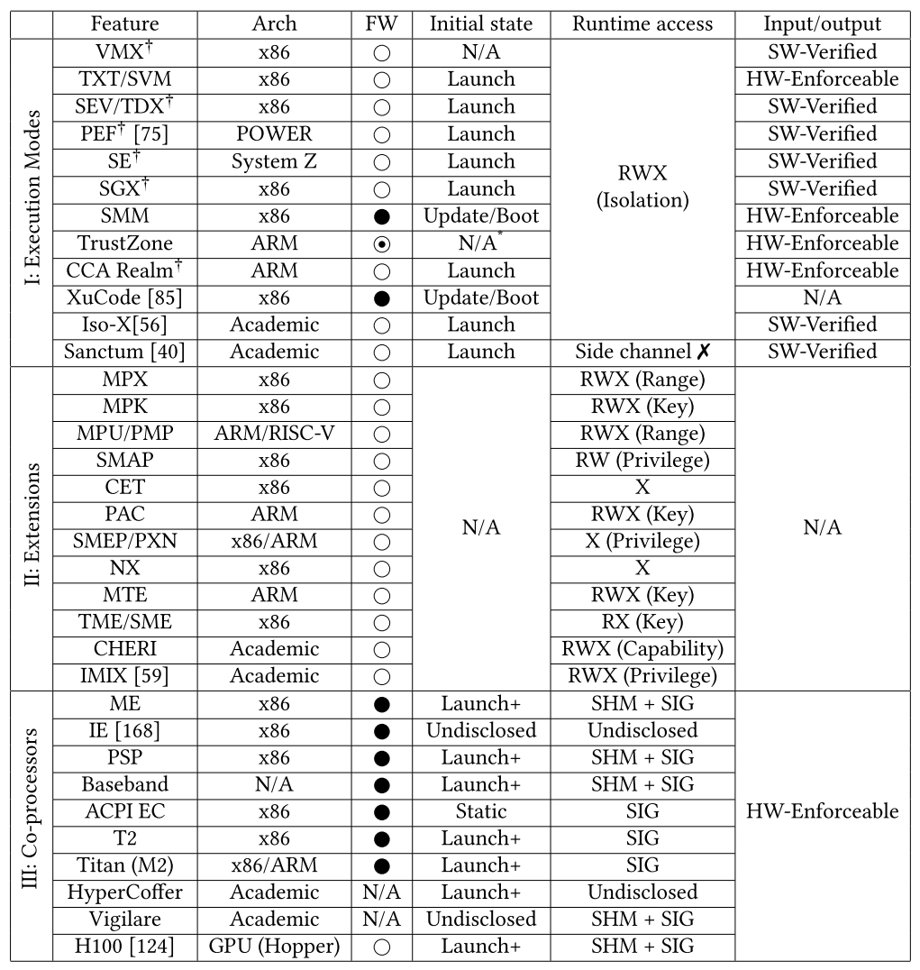 作者讨论的第一个场景,是基于Firmware建立起来的可执行环境(EE),这个听起来好像有点陌生,因为我们作为用户很少会去和这类EE交互。但其实各种设备上基本上都会有这类EE:想象一下,各种设备在最初始上电阶段,都是要依赖firmware来引导和建立一个甚至没有操作系统的环境,而且这个步骤非常重要,一旦被攻击,甚至连后面的操作系统的安全性都没法保证。当然,基于Firmware建立的EE,不仅仅是像Bootloader这类和后续的操作系统运行在不同阶段的EE,有的EE会和基于操作系统的EE共存(例如后面会介绍到的“臭名昭著”的Intel System Management Mode 也就是那个SMM系统管理模式),还有的EE不和主系统共享硬件资源(比如内存),单独占用一个协处理器来完成它的任务。那作者讨论的第二个场景就是我们大家非常熟悉的TEE,这里面既包括了像ARM家的TrustZone也包括了Intel家的SGX和AMD家的SEV。TEE的特点是基本上都和主系统共同运行,硬件资源也基本共享(当然使用了各类隔离手段),而且还提供了许多接口方便TEE和外部环境交互。