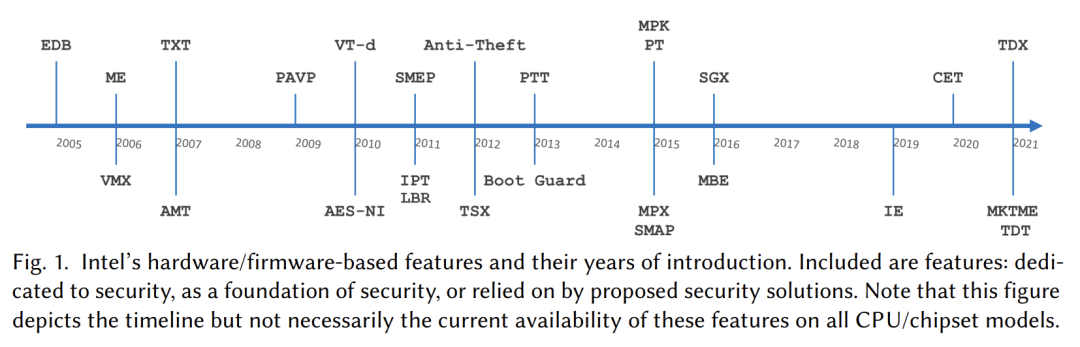 当今搞安全研究,如果不了解安全的历史,你就不能说自己“懂安全”。作者当然也要先说明一下本文做到了博古通今,于是就拿牙膏厂做例子,展示了一下从20年前开始Intel是如何把各种乱七八糟的(安全)特性加入到处理器中(如下图所示)。你对这些特性熟悉也好,不熟悉也好,反正首先可以直观地看出来,通过硬件新特性来增强整个系统的安全,并不是最近才开始的趋势。