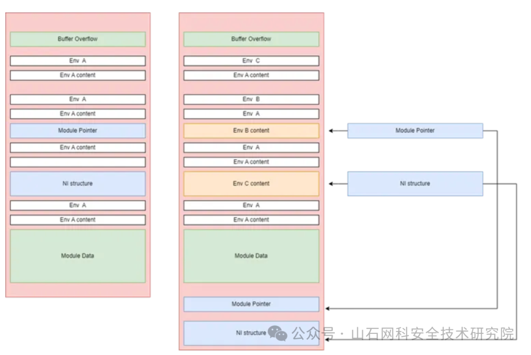 在上图的左侧部分,描述了当前的堆布局。module 指针和 ni 结构体在这些缓冲区中间,随意的溢出将会破坏这些缓冲区的数据。但是,如果我们控制一些其他环境变量来占用它们的位置呢?在这种情况下,它们将无法再占用这些位置,因此将会在不同内存位置进行分配。这正是在上图右边堆图中实现的,我们又定义了两个环境变量B和C,其内容与 module 指针块和 ni 结构堆块的大小相同,新的环境变量占用了先前执行中 module 指针和 ni 结构间隙所占用的空间,从而迫使它们重新定位到不同的位置。