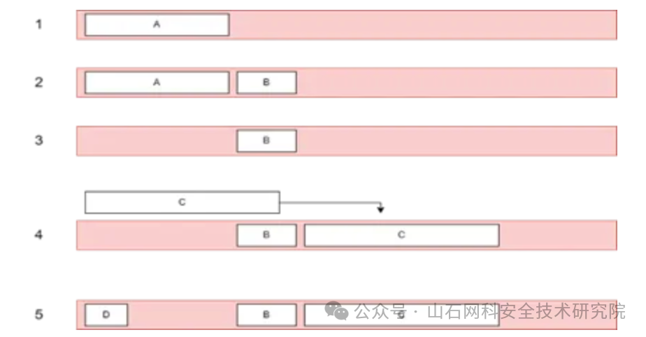 最后,当分配另一组较小的数据D,B和C之前的空间满足要求,所以它可以分配在B和C之前。