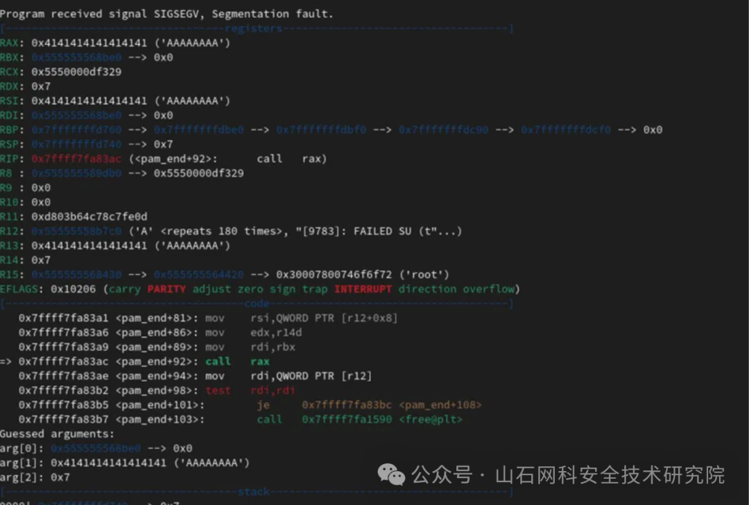 在手动测试期间观察到,如果用户手动输入密码,而不是从 /dev/null 重定向,堆分配会发生变化。因此创建了另一个版本的 fuzzer 来测试,就是使用 forkpty 使用文件描述符向密码发送换行符,这次发现了一些有意思的输出,例如可以找到 Qualys 在其披露中提到的一些案例,比如对“RAX”的调用:
