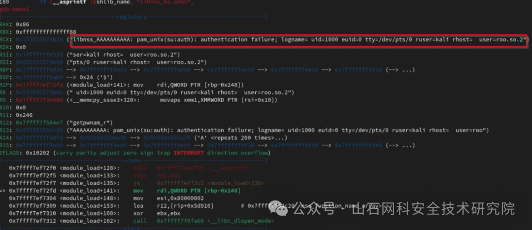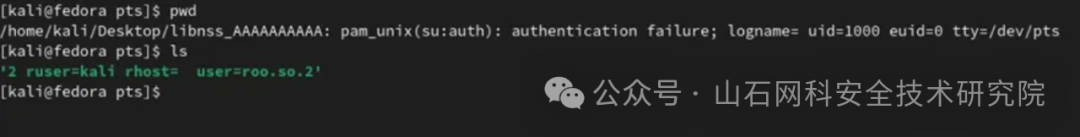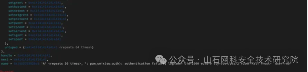 此时程序正在尝试加载名为“libnss_AAAAAAAAAA: pam_unix(su:auth): authentication failure; logname= uid=$uid euid=0 tty=/dev/pts/2 ruser=$user rhost= user=roo.so.2”的共享库。