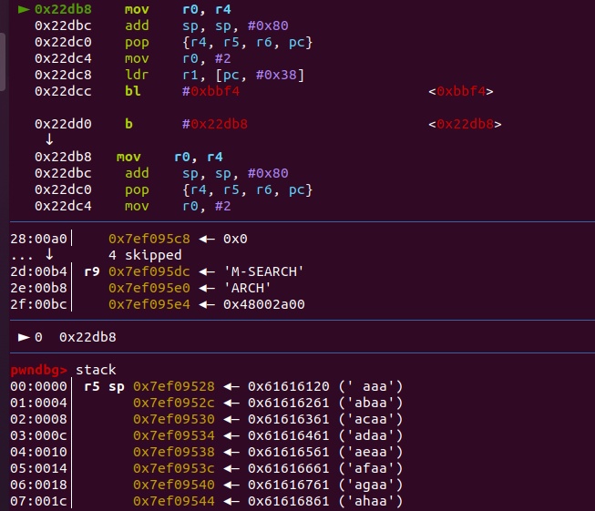 第二次数据发送就是需要对于payload进行构造,这里需要提前计算好在执行完栈迁移的gadget之后,sp指针迁移的位置,选择的gadget如下,会将sp迁移到0x800的位置,执行exp,当执行到这个gadget时如下: