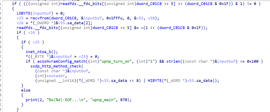 该漏洞原理如下,在recvfrom函数中会向inputbuf中输入0x1ffff大小的内容,并且根据upnp_turn_on的参数也就是之前配置的nvram_ini中的值来判断,如果是1并且strlen的长度小于0x100就可以进入到ssdp_http_method_check函数中,这里需要注意的是,如果在recvfrom的内容中,最前面放入\x00进行截断,那么也可以绕过对应长度的检测。
