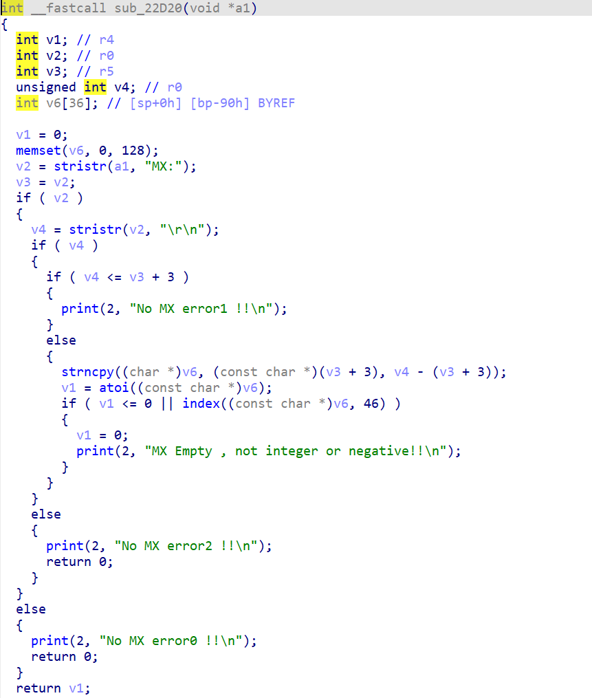 最后就是到达了漏洞触发的位置也就是sub_22D20函数中,具体代码如下,这里首先是提取了MX:后面的内容,并且利用strncpy进行复制,但是这里并没有判断复制长度的大小,因此可以再次构造出栈溢出来执行命令执行。