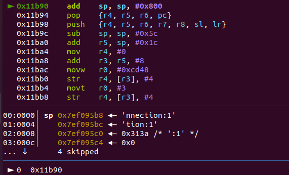 通过调试我们可以发现函数结束时sp会增加0x80,并且pop来控制r4,r5,r6寄存器,印记经过计算,只需要填写0x80 + 0x4 * 3 = 140个字节,因此垃圾数据就是139个字节(去除空格),之后便是填入栈迁移的地址0x11B90,便可根据第二次数据发送的内容,最终实现栈迁移来执行rop链。