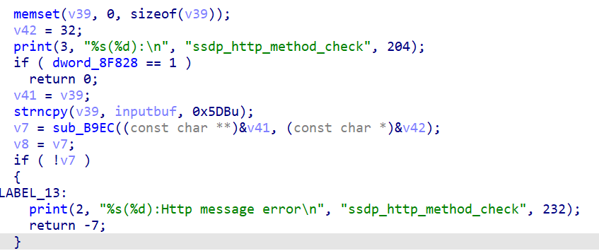 之后进入到ssdp_http_method_check函数之后会进行判断,利用strncpy将inputbuf复制到v39中,之后进入到sub_B9EC。