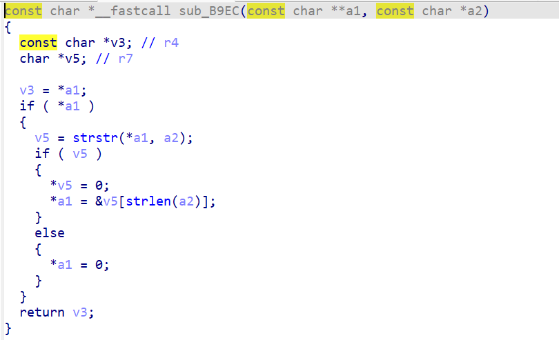 这里进入sub_B9EC中会对于字符串进行赋值,通过刚才所说的可以知道如果我们在发送的数据中,第一个字节为\x00,那么进入到sub_B9EC之后输出的v7的值为0,并且进入下面的判断,会输出Http message error。
