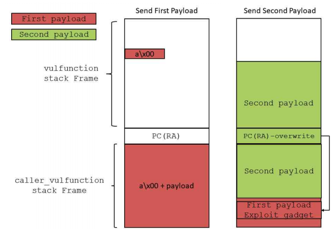 综上对于漏洞触发的原理已经讲解完毕,这里利用上述参考文章中的图进行讲解exp原理,首先第一次我们发送payload,这里需要计算好距离sub_22D20之后偏移的距离,并且写上需要的rop链,之后第二次进行攻击的时候,便是覆盖sub_22D20的返回地址,并且执行栈迁移,最终将pc寄存器指向rop链上。