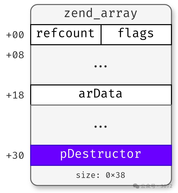 pDestructor是一个指向负责从数组中删除元素的函数的指针。它通常指向zval_ptr_dtor,PHP的变量销毁函数。改变它的值允许我们获得RIP:当数组被删除时,它的元素也被删除,因此pDestructor被调用。