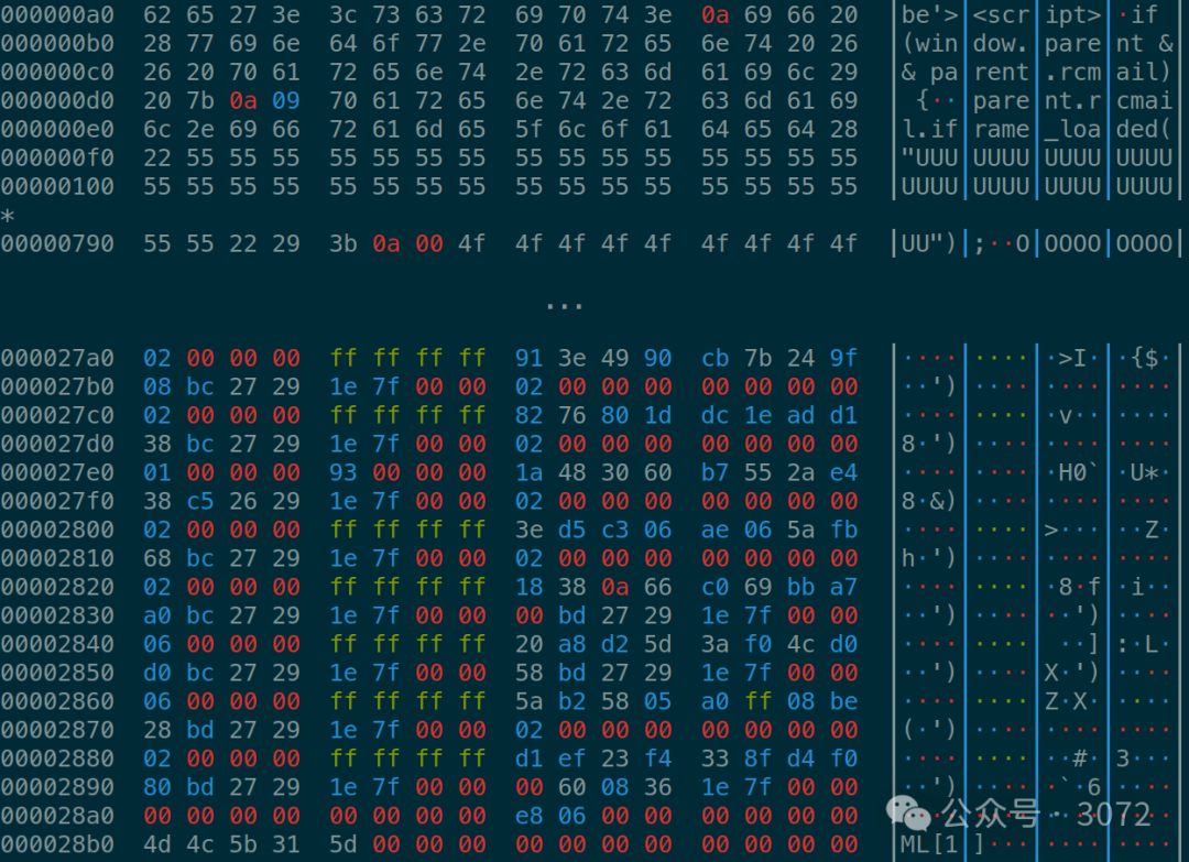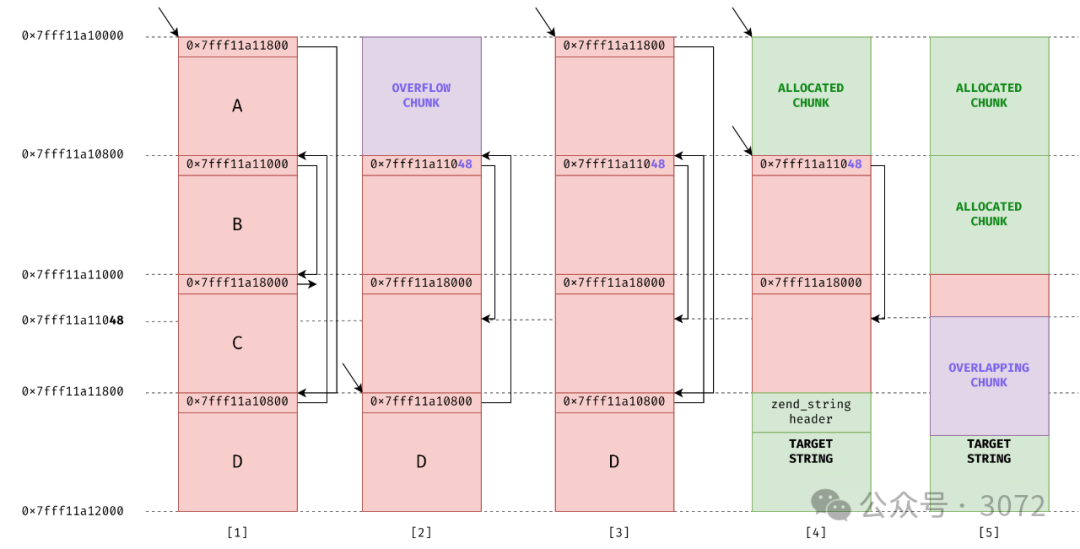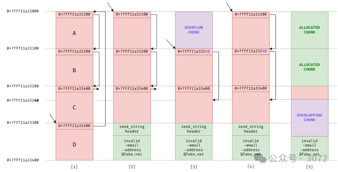 为了实现这一点,我们将 invalid_email 设置为 0x63c ASCII 字节,后面跟着 0x37 个空字节。当错误消息被 JSON 序列化 [2] 时,由于它包含的空字节,$args[0] 的大小大大增加:每个空字节都变成了它的 unicode 转义表示,\u0000。因此,JSON 编码的 $args[0] 的大小约为 0x786 字节。因此它被分配在 B 中。sprintf() 调用增加了一些字节,导致在 C’ 中分配了一个新的大小为 0x800 的块。在这一点上,我们已经成功地覆盖了 D 的头部:$out 的大小在被 sprintf() 的结果连接之前大大增加了 [2]!