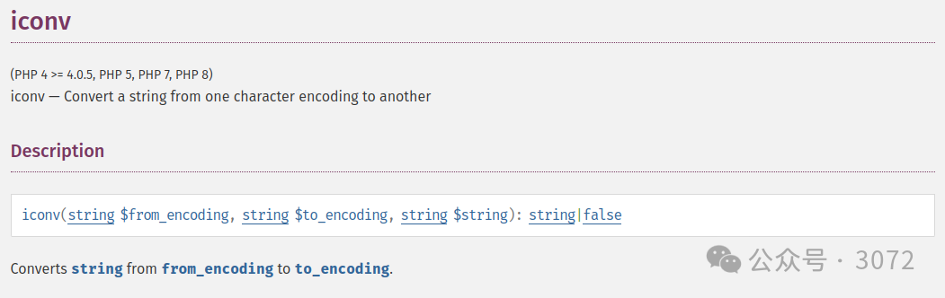 虽然使用php://filter触发这个漏洞非常方便,但达到iconv()调用的最明显方式是使用其同名API。在PHP中,它的原型如下: