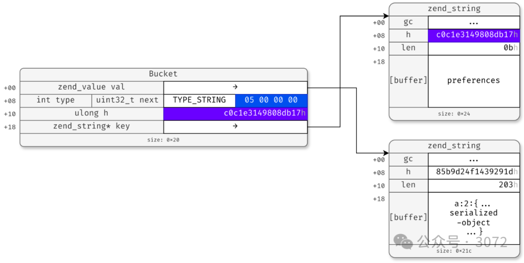 显然,在正常使用情况下,$_SESSION[‘preferences’] 无法被用户修改。然而,我们不仅仅是普通用户:我们可以在堆中写入!因此,我们只需要使两个块重叠并覆盖这个会话变量的 zend_string 就可以了!