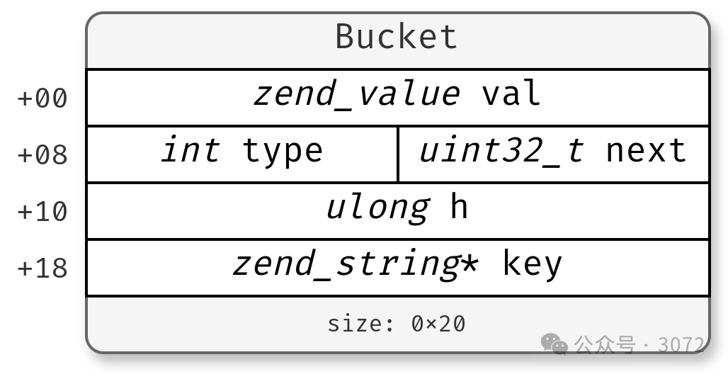 第一个元素 val 是一个简单值(long、float)或指向值的指针(zend_string、zend_object 等)。type 定义变量类型。next 表示列表中下一个 Bucket 的索引(稍后详细介绍)。key 存储在 Bucket.key 中,其 DJBX33A 哈希 存储在 Bucket.h 中。