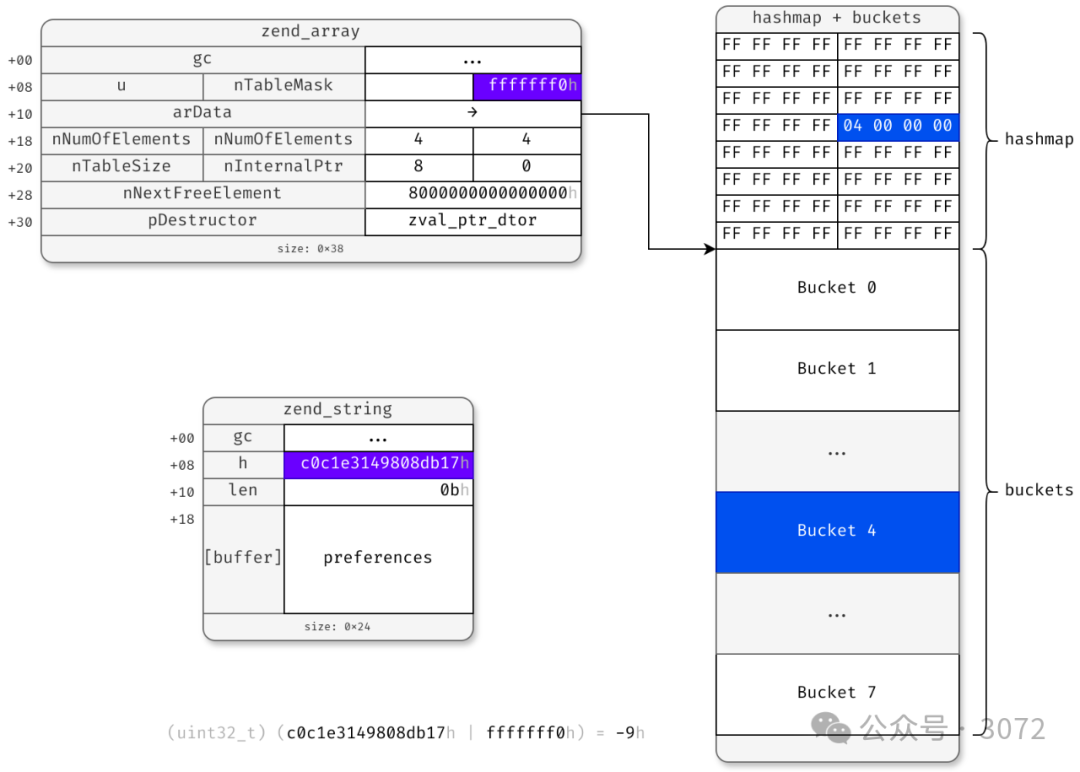 zend_array.arData 指向这个蝴蝶结构:该结构底部是 buckets 列表,顶部是 hashmap。hashmap 允许你将 zend_string 哈希转换为 buckets 列表中的索引:当尝试访问某个键的值时,PHP 将表格掩码(zend_array.nTableMask)与键的哈希(zend_string.h)OR 起来,得到一个负的 int32_t,它将作为从 (uint32_t[]) arData 指针的索引。