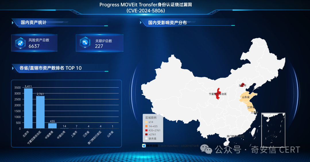 奇安信鹰图资产测绘平台数据显示,Progress MOVEit Transfer身份认证绕过漏洞(CVE-2024-5806)关联的国内风险资产总数为6637个,关联IP总数为227个。国内风险资产分布情况如下:
