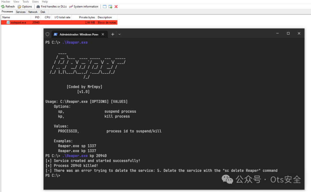 注意:Reaper 不会终止 Windows Defender 进程,因为它具有保护功能,Reaper 是一个简单的概念证明。
