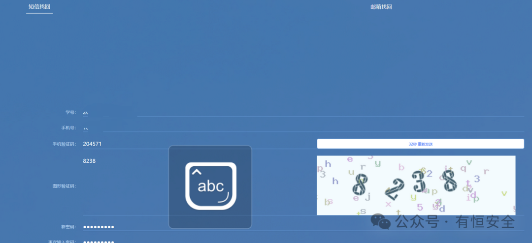 5、打开b学校的找回密码功能,输入杨**学生的学号与刚才越权绑定的手机号,获取验证码信息,新密码为Aa123456@